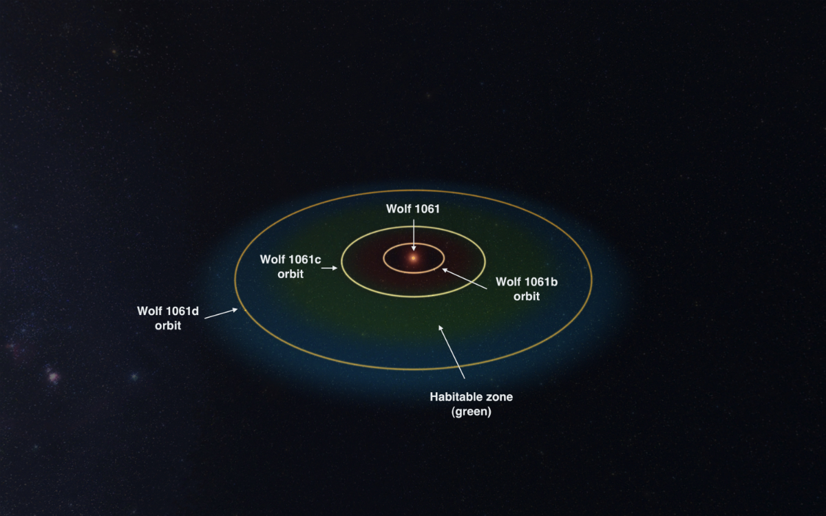 Средняя планета, Wolf 1061c, расположилась в так называемой обитаемой зоне, то есть на ней могут быть условия, пригодные для сохранения воды в жидкой форме, а возможно, даже для жизни. Интересно то, что родительская звезда этой планеты очень близка к нам, мы почти соседи, то есть, вероятно, мы сможем наблюдать развитие обитаемости на этой планете.