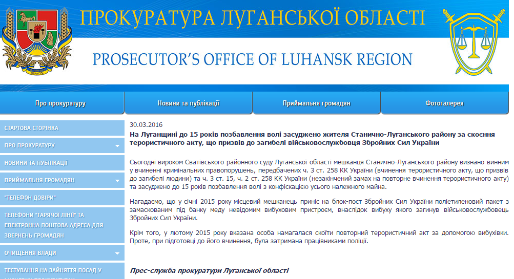 К 15 годам лишения свободы приговорили жителя Станично-Луганского района за подрыв блок-поста оккупационных сил взрывным устройством, замаскированным под банку мёда.