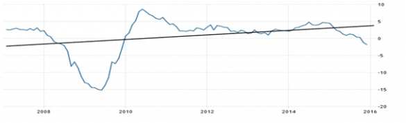5) Горное производство в Соединенных Штатах сократилось в декабре 2015 г.на 11.20% год к году. Рост достигнул рекордно уровня 13.80% в декабре 2014 года. Здесь также рисуется спад, даже более значительный, чем уровень 2008 г. (см ниже).