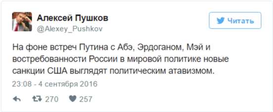 «На фоне встреч Путина с Абэ, Эрдоганом, Мэй и востребованности России в мировой политике новые санкции США выглядят политическим атавизмом», — написал Пушков в своем микроблоге в Twitter.