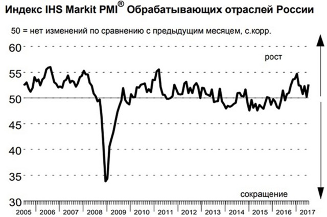 Индекс деловой активности (Purchasing Managers Index, PMI) в промышленности России в июле 2017 г. достиг 52,7 пункта, по сравнению с 50,3 пункта месяцем ранее.