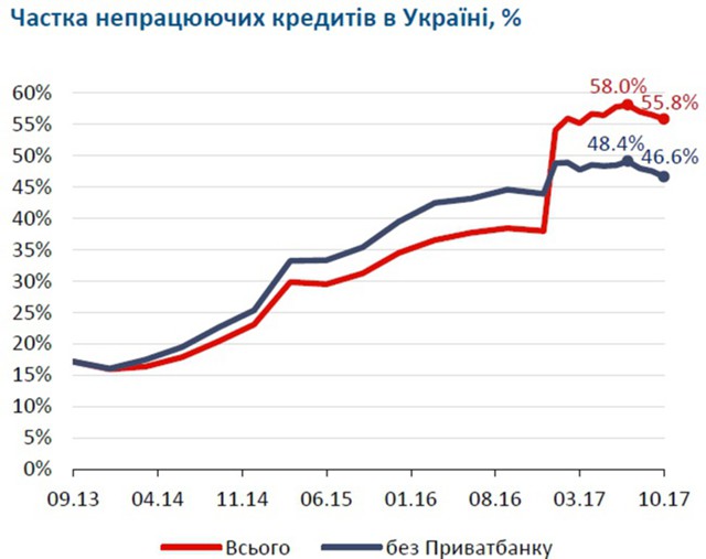 По доле проблемных кредитов (non-performing loans, NPL) Украина обогнала Экваториальную Гвинею (28%, 2016 г.), Грецию (37%, 2016 г.), Нигерию (38%, 2010 г.) , Афганистан (50%, 2010 г.) и ряд других государств.