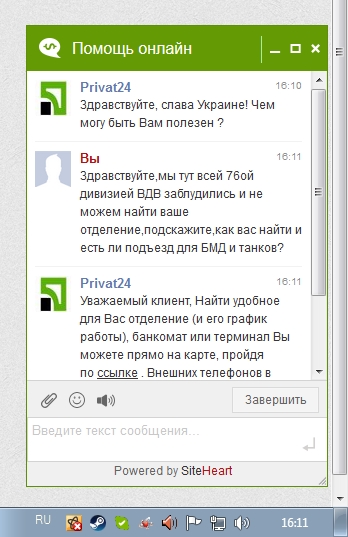 C сентября—октября, любой клиент означенного банка может заказать себе банковскую карту каноничных «жовто-блакитных» колеров, украшенную вдобавок бандеровской речёвкой «слава Украине — героям слава». Справедливости ради, другие обязательные компоненты кричалок украинских неофашистов — про нацию, смерть врагам и прежде всего — москалям, кредитки пока не украшают. Зато «славаукраинить» ПриватБанк усиленно пытался на уровне поддержки пользователей. Которые, общаясь с оператором, вынуждены были слышать этот рефрен минимум 3–4 раза за сеанс.