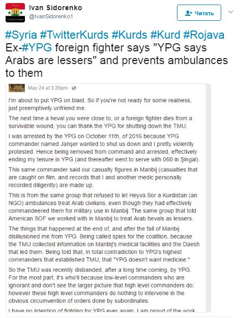 Also, more often and often foreign volunteers in SDF like Patrick Kasprik (his text already blocked in facebook) revealed information about relations with YPG inside the alliance and this picture is not so good. Looks like kurds thinks that not only Arabs are lesser, but foreigners are too.