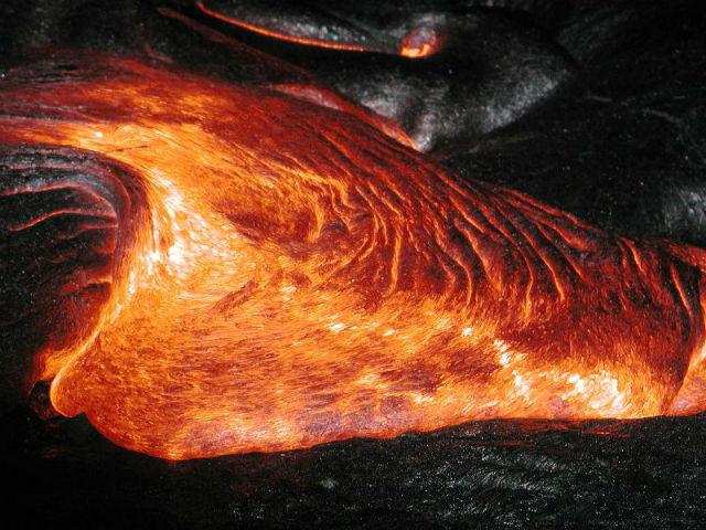 Видео снято рядом с вулканом Килауэа на Гавайях. Средняя температура извергаемой лавы составляет от 700 до 1200 °C.