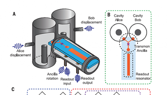 Если в эти камеры запустить несколько фотонов, «запутанных» между собой на квантовом уровне, то вся конструкция превращается в единого кота Шредингера, разделенного на две части — то, что происходит с фотонами в одном из резонаторов, будет отражаться на судьбе частиц во второй камере.