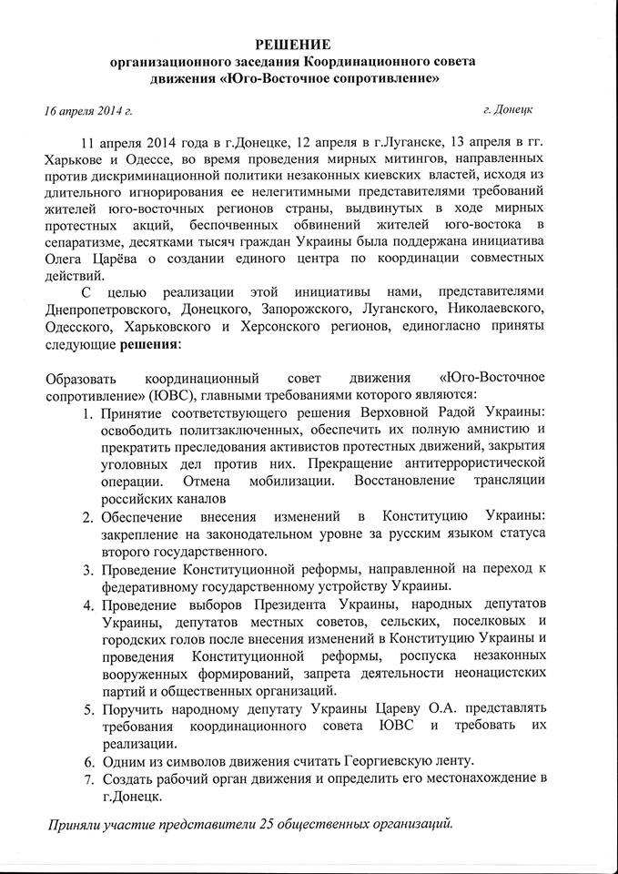 Мы провели первое, организационное, заседание Координационного совета движения «Юго-Восточное сопротивление». Совет будет координировать действия всех наших сил. Мы хотим создать такую модель государства, где каждый будет чувствовать себя человеком. Человеком не второго сорта, не изгоем с неправильной речью или неправильной историей, а полноценным гражданином.