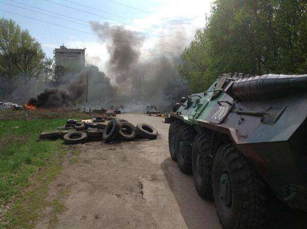 По поступившей только что информации атака на Славянск с северной стороны отбита. БТРы нацгвардии отступают в сторону Изюма под прикрытием трех вертолетов. Имеется информация о потерях среди бойцов нацгвардии.