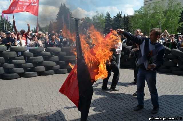 Митингующие на площади перед зданием Енакиевского городского совета зажгли свечи в память о погибших в Одессе активистов Сопротивления и сожгли черно-красное полотнище – официальный флаг бандеровского движения, также используемый правоэкстремистской группировкой «Правый сектор».