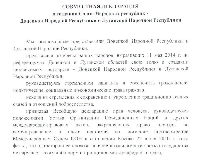 принимаем Совместную декларацию о создании Союза Народных Республик – Донецкой Народной Республики и Луганской Народной Республики, а так же заявляем о следующем: