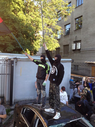 Для начала они перекрасили табличку на здании в цвета украинского флага, после этого они установили на одну из машин звукоусиливающую аппаратуру и стали включать украинские патриотические песни. Митингующие вели себя все более агрессивно и забросали посольство камнями и яйцами.