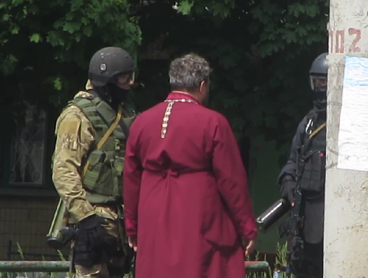 Настоятель храма блаженной Ксении Петербургской г. Краматорск протоиерей Сергий Миронов остановил колонну украинских войск и поспособствовал выводу за территорию города. Батюшка в тельняшке и с георгиевской лентой уговаривал украинские подразделения на БТР-ах покинуть Краматорск, чтобы не провоцировать мирных жителей. И они вняли доводам священнослужителя, отправившись за черту города