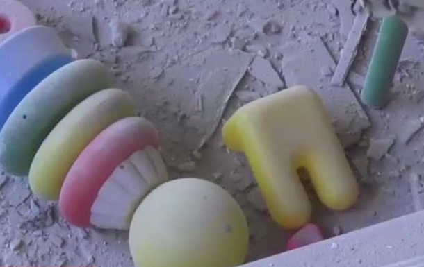 На кадрах видно, что прямым попаданием мин раззворочена крыша детского дома, практически ничего не осталось от нескольких стен. На полу в комнатах валяются кирпичи, разбитые стекла, сломнная мебель и детские игрушки.