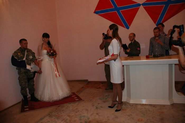 Сегодня, 11 июля, в Донецке состоялось бракосочетание известного командира ополченцев ДНР Моторолы и ополченки Елены, жительницей пригорода Славянска - Семеновки. Их брак стал первым официально зарегистрированным в Новороссии, молодоженам выдали свидетельство о браке с номером 0001.