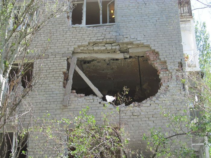 Ул. Воробьева 9 — снаряд попал в балкон верхнего этажа.