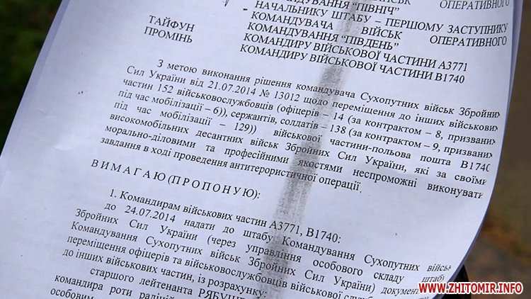 Старший солдат Владимир Лукьянчук показывает документ и зачитывает причину перевода десантников: «по своим морально-деловым и профессиональным качествам не в состоянии выполнять задания в ходе проведения антитеррористической операции». Солдат подчеркивает, что он не против перевода, но кто же останется в зоне АТО?