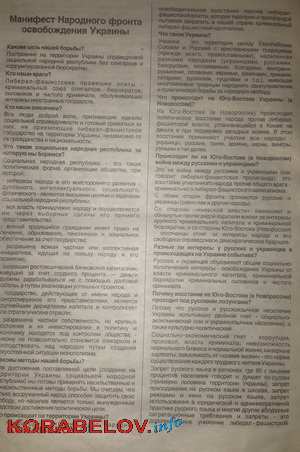 Листовки призывают к восстанию против «либерально-фашистской диктатуры» и власти поддерживаемого США и ЕС криминального капитала, к союзу с народами России и созданию нового федерального государства на территории Украины - «социальной народной республики».