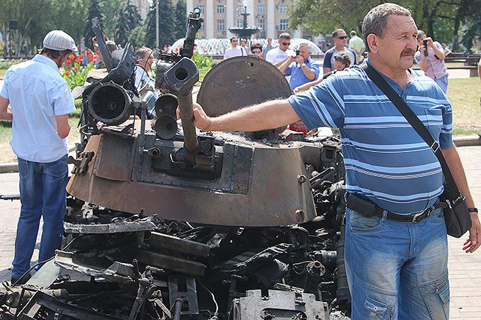 Утренняя бомбардировка, впрочем, не распугала оставшихся жителей Донецка, которые к полудню начали собираться на центральной площади Ленина. Сюда накануне ополченцы свезли трофейную сожженную технику. Для наглядности. Разорванные БМП, обугленные БТР, зенитные установки с куском оплавившегося жовто-блакитного прапора на стволах... Особый интерес у местных вызывает установка «Град» и гаубица Д-30: «Они на сколько километров стреляют? На 20? Так вот с чего по нам круглые сутки лупят!»