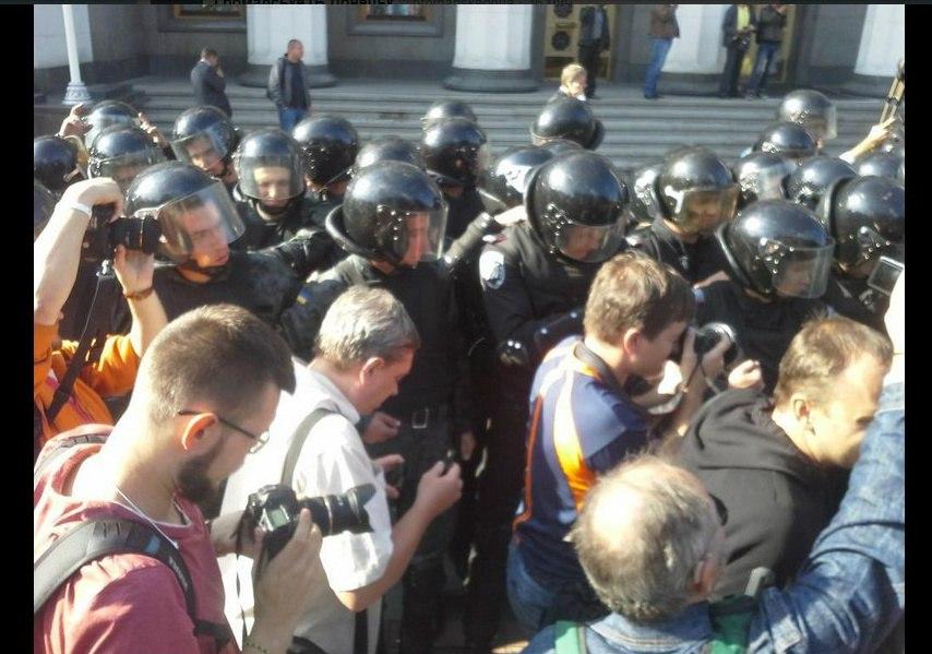 Как сообщает РБК-Украина, парламент атакуют 30 активистов «Правого сектора». Они с флагами пытаются пробиться сквозь кордон милиции к центральному входу в Раду. Им преграждают путь около 70 бойцов Нацгвардии.