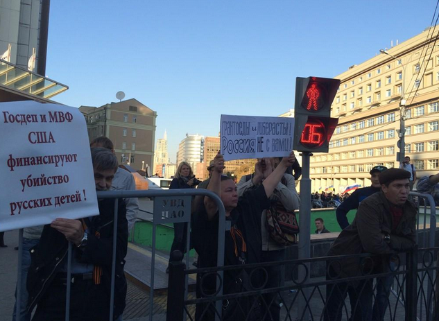 Ранее в воскресенье у посольства США в Москве прошел пикет против военных действий на Украине. Пикетирующие называли Порошенко «американским шпионом», а Обаму призывали «оставить в покое Украину» и «вернуть Нобелевскую премию мира».