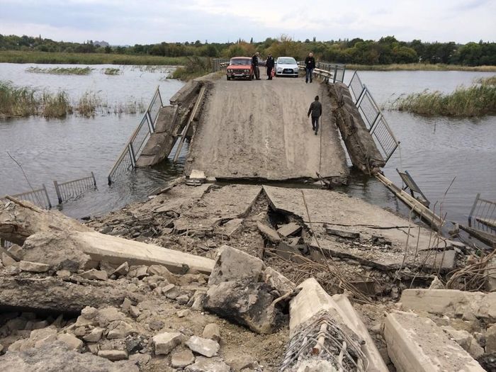 Учитывая, что бежавшие нацисты взорвали мост через Крынку, то людям приходится сталкиваться с огромными проблемами. Чтобы перенести что-то тяжелое или габаритное нужно сделать крюк километров в 20–30. Перейти через реку конечно можно и пешком: люди привязали к остаткам моста трос, придерживаясь за который можно спуститься вниз к реке, а затем подняться на другую сторону. Не нужно и говорить, что подобная процедура для пожилых людей трудно выполнима.
