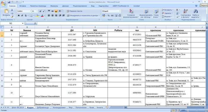 Список личного состава батальона «Донбасс» содержит вкладки «Штат 09.2014», «Кадры», «Добровольцы», «Командировки», «Мир», «Пополнение», «Киев» и «Анкета». Данный список предоставляем вам для ознакомления.