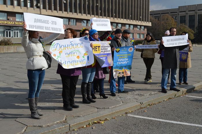 Ко дню выборов в ДНР и ЛНР в Запорожье попытались провести показательное шествие противников «сепаратизма» из числа вынужденных переселенцев. Пришло целых 11 человек, никто из которых, правда, не показывал в объектив своего паспорта.