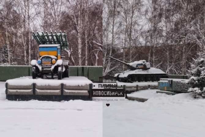 Голубой и желтый цвета появились на военной технике на Монументе Славы в Новосибирске. Изображения украинских флагов оставили неизвестные в пятницу. Это уже не первый акт вандализма за декабрь.