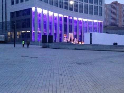 У центрального входа в НСК «Олимпийский» зажгли подсветку на лестнице. Гости прибывают с цветами.