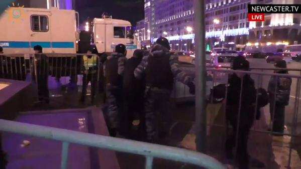 21:01 В последние несколько минут действия полиции на Манежной площади стали жестче. Журналисты, стоящие в первых рядах между активистами и полицией, в своих твиттерах жалуются на подножки, которые ставит полиция во время выдавливания.