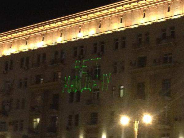 Также на стене напротив отеля «Ритц Карлтон» кто-то лазером высветил надпись: «Нет Майдану».