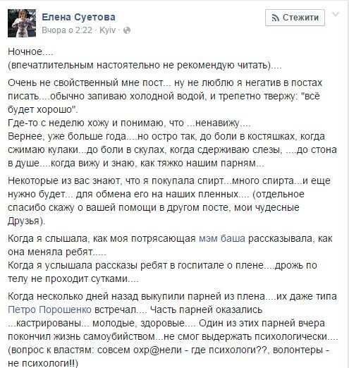 «Когда несколько дней назад выкупили парней из плена... их даже типа Петро Порошенко встречал…. Часть парней оказались …кастрированы… молодые, здоровые…. Один из этих парней вчера покончил жизнь самоубийством…не смог выдержать психологически…», — написала Суетова.