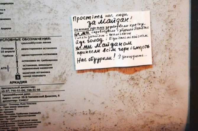 Вот текст листовок в переводе на русский язык: «Простите нас, люди, за Майдан! Нашими руками разрушили страну. Это мы спровоцировали и возмутили Донбасс.