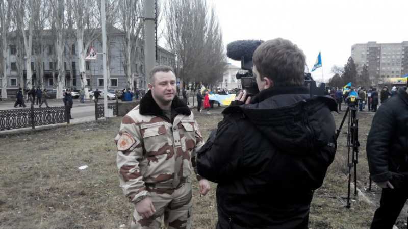 Принимают участие в митинге представители Правого сектора, общаясь с горожанами, высказывая свою позицию перед журналистами.