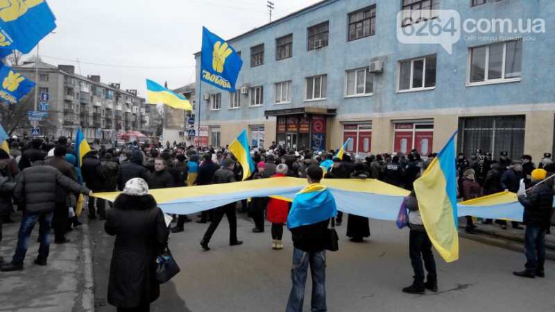 Проукраински настроенные митингующие кричат «Украине слава!», «Схід і Захід разом!», «Смерть российским оккупантам!»