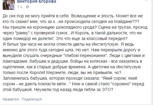 "До сих пор не могу прийти в себя. Возмущение и злость. Может все же кто-то скажет мне, что за ***ня происходила сегодня на Майдане???