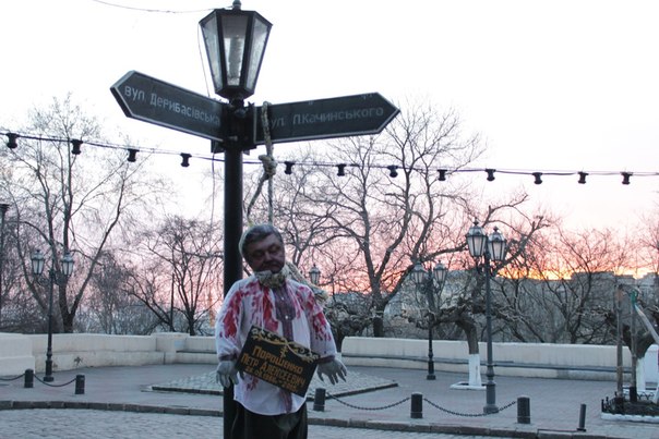 Минувшей ночью на указательном столбе, расположенном на перекрестке улиц Дерибасовской и Леха Качинского возле памятника Иосифу де Рибасу, появилось чучело с лицом Петра Порошенко, которое было одето в окровавленную вышиванку.