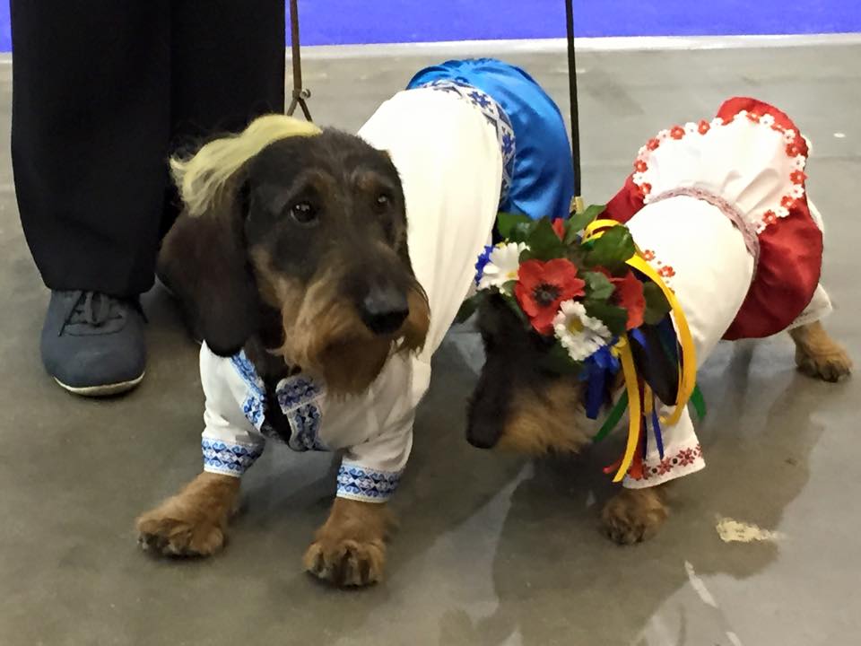 В Киеве в ходе проведения международной выставки собак устроили парад животных, наряженных в рубахи-вышиванки и шаровары. На некоторых при этом даже были шапки, чепчики и венки.