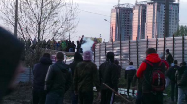 Люди начали сносить забор на месте строительства. Неизвестные в ответ изнутри бросают дымовые шашки и петарды.