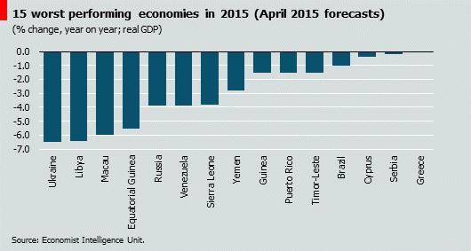 С апреля прошлого года украинская экономика сократилась на 6,5%. На втором месте оказалась Ливия со снижением на 6,4%, на третьем – Макао, ВВП которой уменьшился на 6%. На четвертом месте – Экваториальная Гвинея с сокращением ВВП на 5,5%. Пятое место заняла Россия, экономика которой за год сократилась на 4%. Сокращение ВВП России, как и Экваториальной Гвинеи, связано с падением цен на нефть.