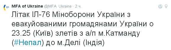 Министерство иностранных дел Украины сообщило, что в 23:25 (мск) Ил-76 Минобороны Украины вылетел из столицы Непала Катманду и взял курс на Дели (Индия).