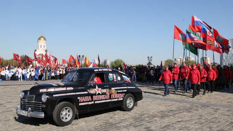 После исполнения гимна Российской Федерации на площадь перед стелой Победы въехала колонна автопробега. Возглавлял колонну экипаж раритетного автомобиля марки «Победа».