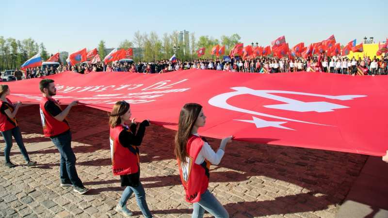В кульминации торжественной встречи автопробега молодые активисты движения «Антимайдан» развернули масштабную копию Знамени Победы — главный символ проекта Наша Великая Победа.