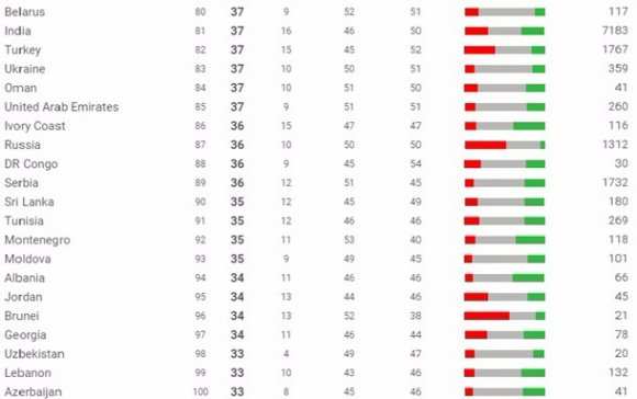 Согласно данным, украинцы разместились на 83-й позиции, а россияне на 87-й.