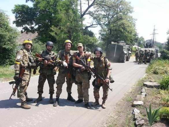 Бронетранспортер AT-105 Saxon и бронированные машины КрАЗ/Streit Spartan 25-й отдельной Днепропетровской воздушно-десантной бригады вооружённых сил Украины в районе Марьинки (Донецкая область). 04.06.2015 © twitter.com
