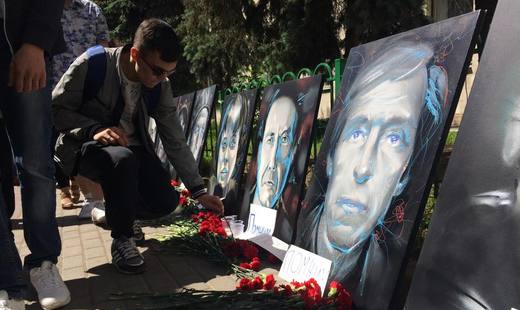 Активисты движения «Антимайдан» зажгли свечи и возложили цветы в Леонтьевском переулке, напротив посольства Украины в России, в память о работниках СМИ, которые погибли, выполняя свой профессиональный долг.