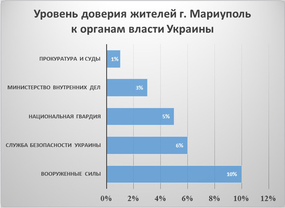 Из числа тех, кто решился ответить на вопросы, доверие к ВСУ испытывают 10%, 6% граждан поддерживают деятельность СБУ, а вот нацгвардию и МВД — только 5% и 3% соответственно. Абсолютно не верят жители Мариуполя в эффективность прокуратуры и судов — о доверии к ним заявил лишь 1% респондентов.