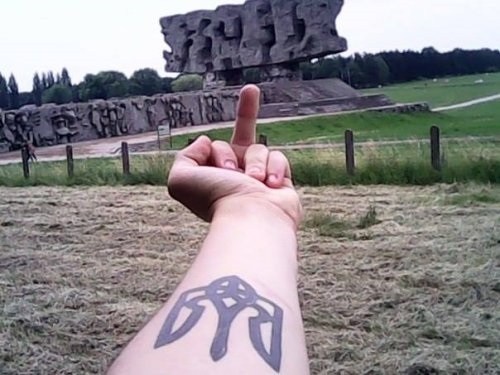Украинский студент Влад Кучер опубликовал на своей странице в сети ВКонтакте оскорбительную фотографию с нецензурным жестом в сторону мемориала погибшим в концлагере Майданек евреям.