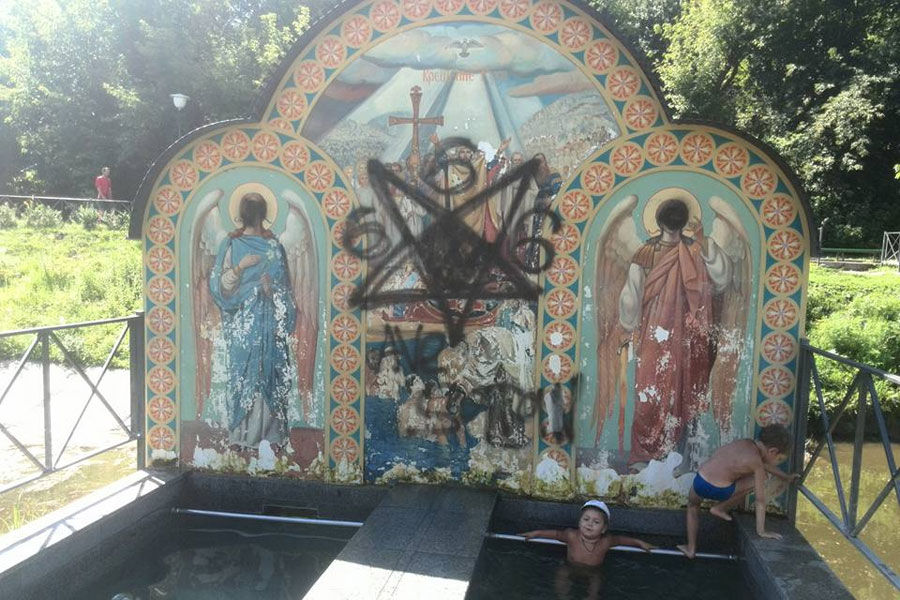 Ночью на иконах возле купальни в Китлярчином яру на Салтовке появились сатанинские символы.