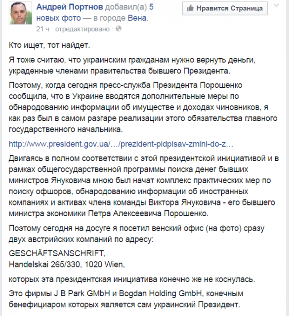 Портнов выяснил, что две австрийские компании J B Park GMbH и Bogdan Holding GmbH имеют одного директора, один адрес, и через множество подставных оффшоров владеют большинством кондитерских, автомобильных и сельскохозяйственных активов Порошенко в России и на Украине.